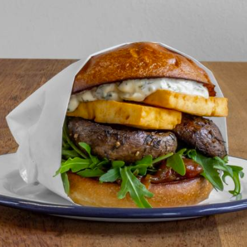 Comes with roasted field mushroom, fried halloumi, rocket, spiced tomato relish, herb dressing and milk bun.